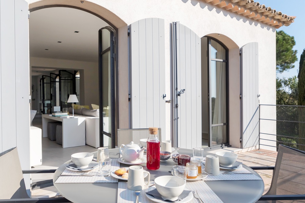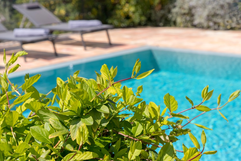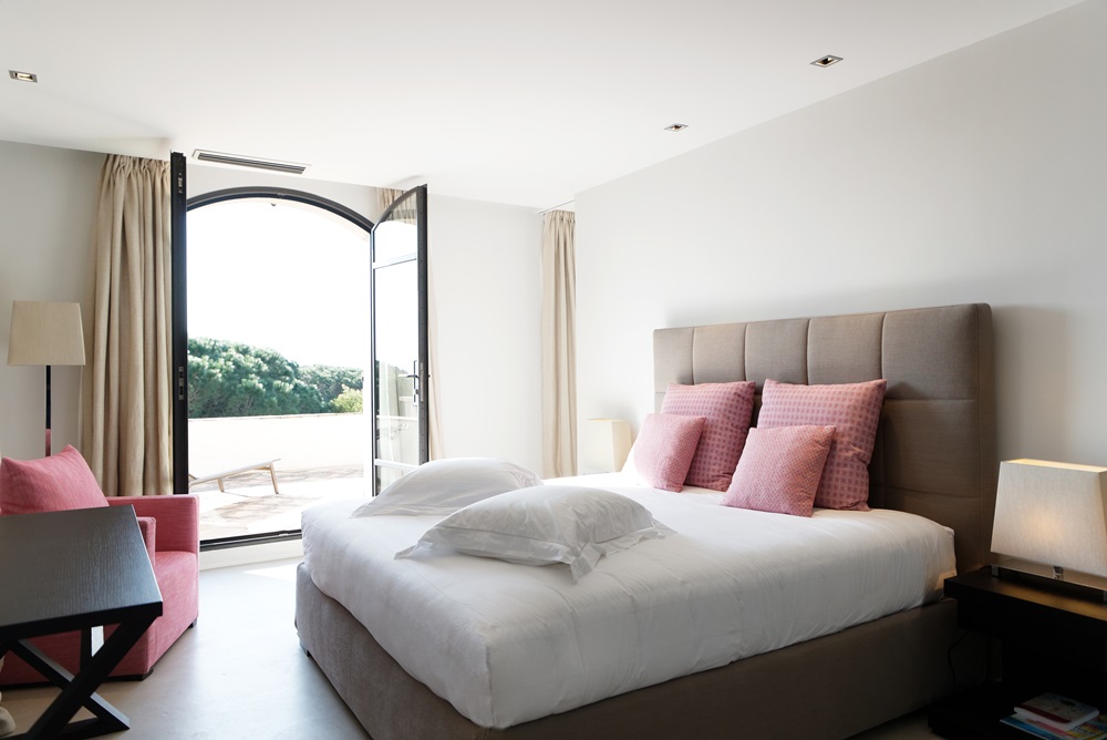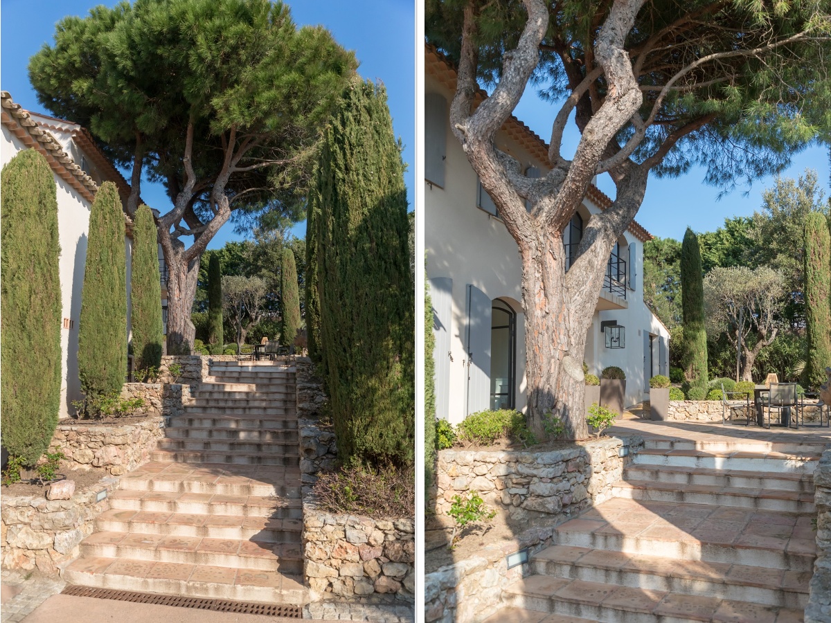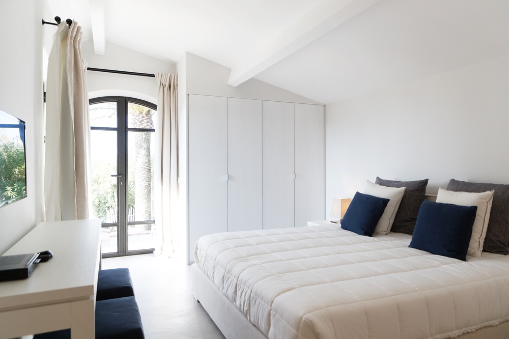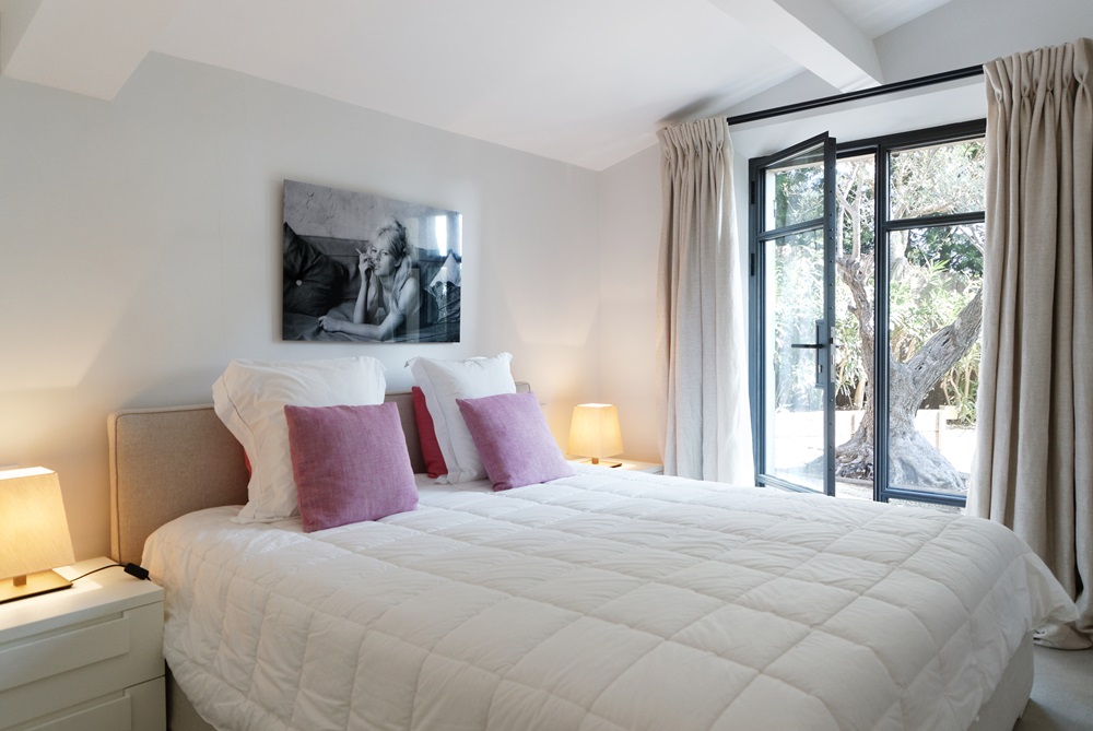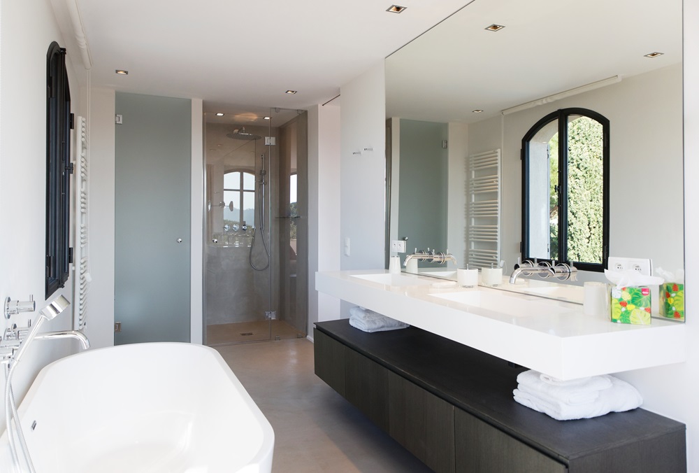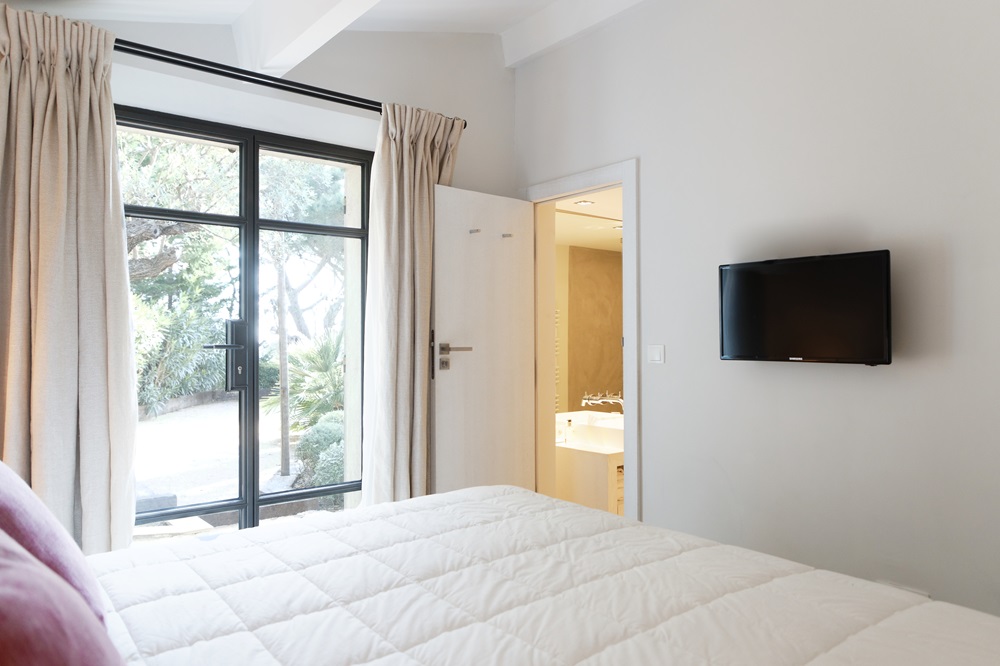 Ground level. Entrance hall. Open plan contemporary fully equipped kitchen (steam oven/mixer/two dishwashers/ etc…), with access to main covered terrace and outdoor dining area. Living room with fireplace and flat screen TV opening to a small terrace on the side of the villa with sea views. This one is ideal at breakfast time. A few steps down to the right-hand side of the entrance hall give a separate access to the pool area and garden. Guest toilets are on this level. First double bedroom (King size/180 cm bed), en suite shower room, washbasin and wc. Separate access with steps leading to the garden and pool. A second double bedroom (King size/180 cm bed), en suite shower room, washbasin and wc to the other side.