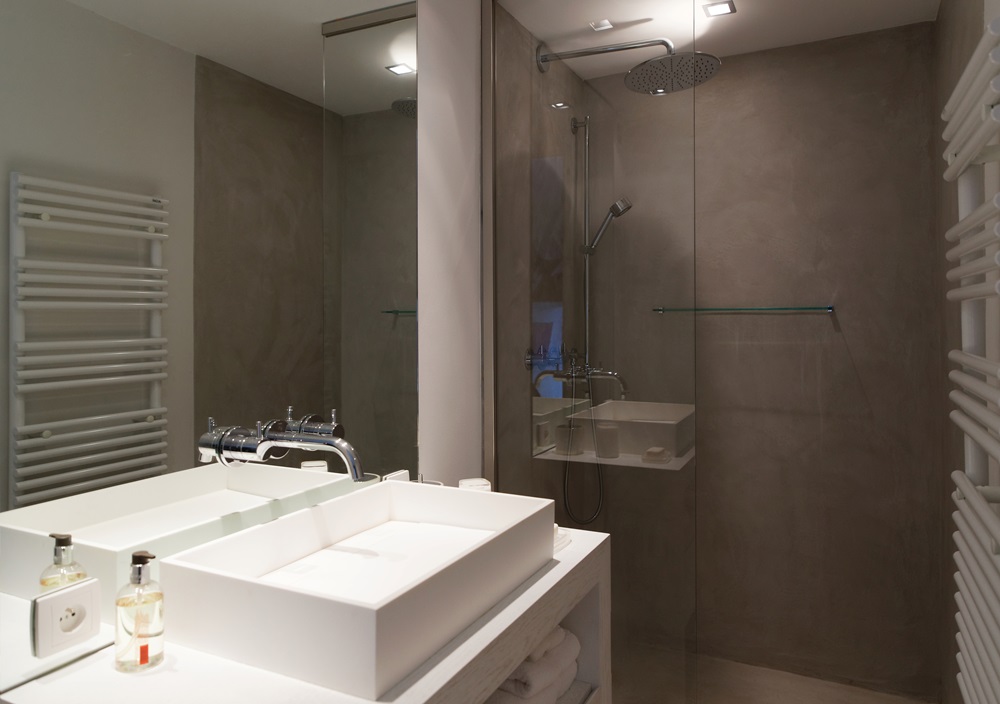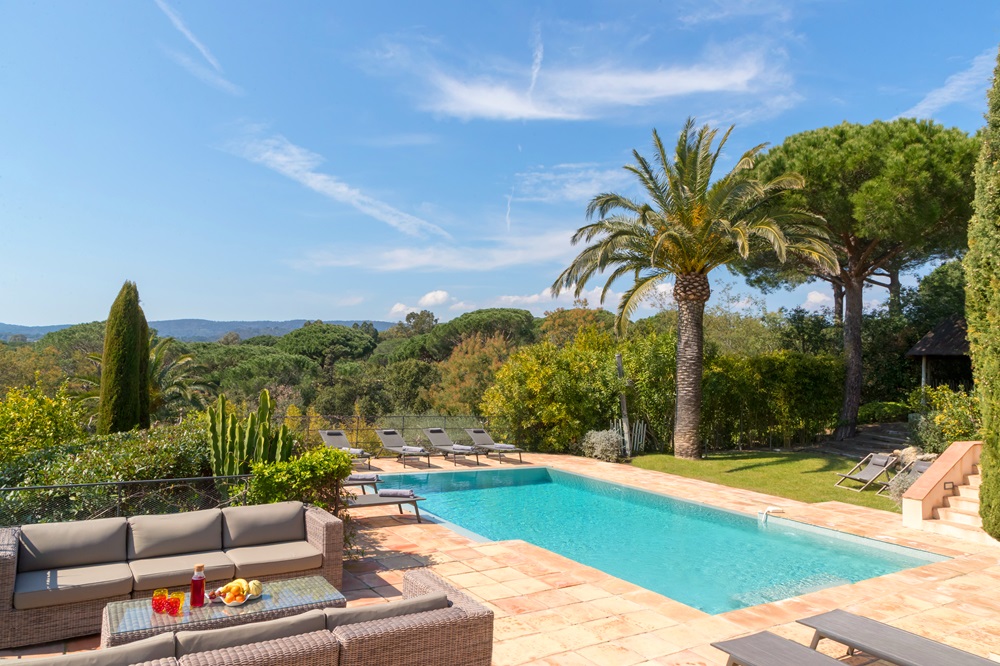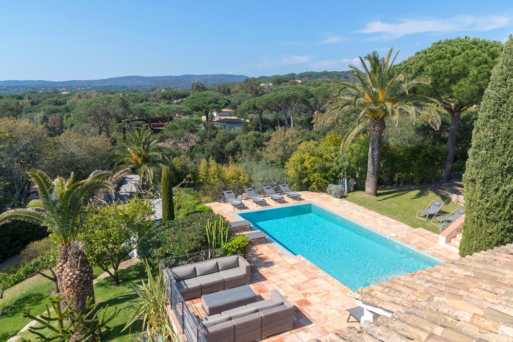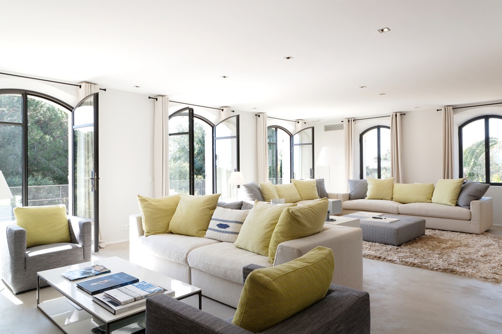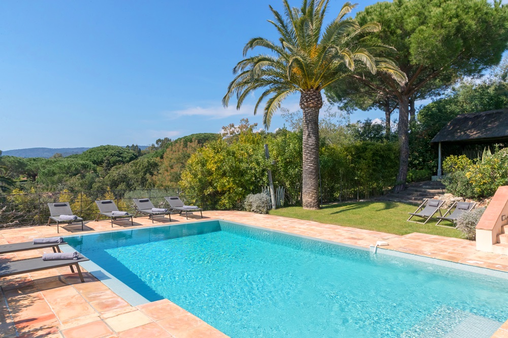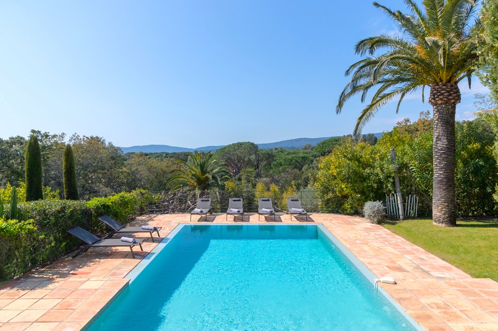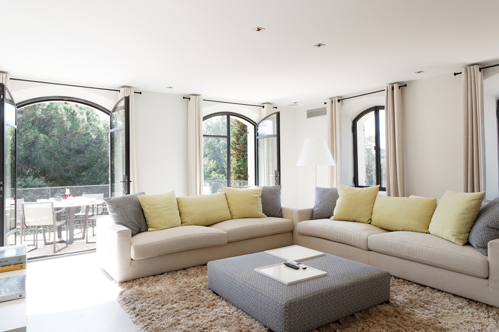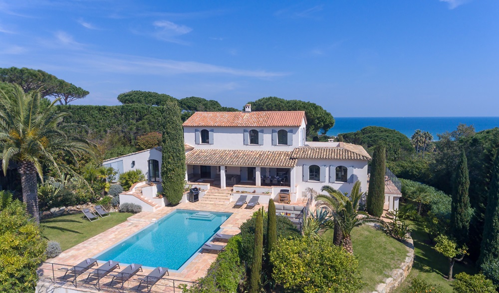 Ground level. Entrance hall. Open plan contemporary fully equipped kitchen (steam oven/mixer/two dishwashers/ etc…), with access to main covered terrace and outdoor dining area. Living room with fireplace and flat screen TV opening to a small terrace on the side of the villa with sea views. This one is ideal at breakfast time. A few steps down to the right-hand side of the entrance hall give a separate access to the pool area and garden. Guest toilets are on this level. First double bedroom (King size/180 cm bed), en suite shower room, washbasin and wc. Separate access with steps leading to the garden and pool. A second double bedroom (King size/180 cm bed), en suite shower room, washbasin and wc to the other side.