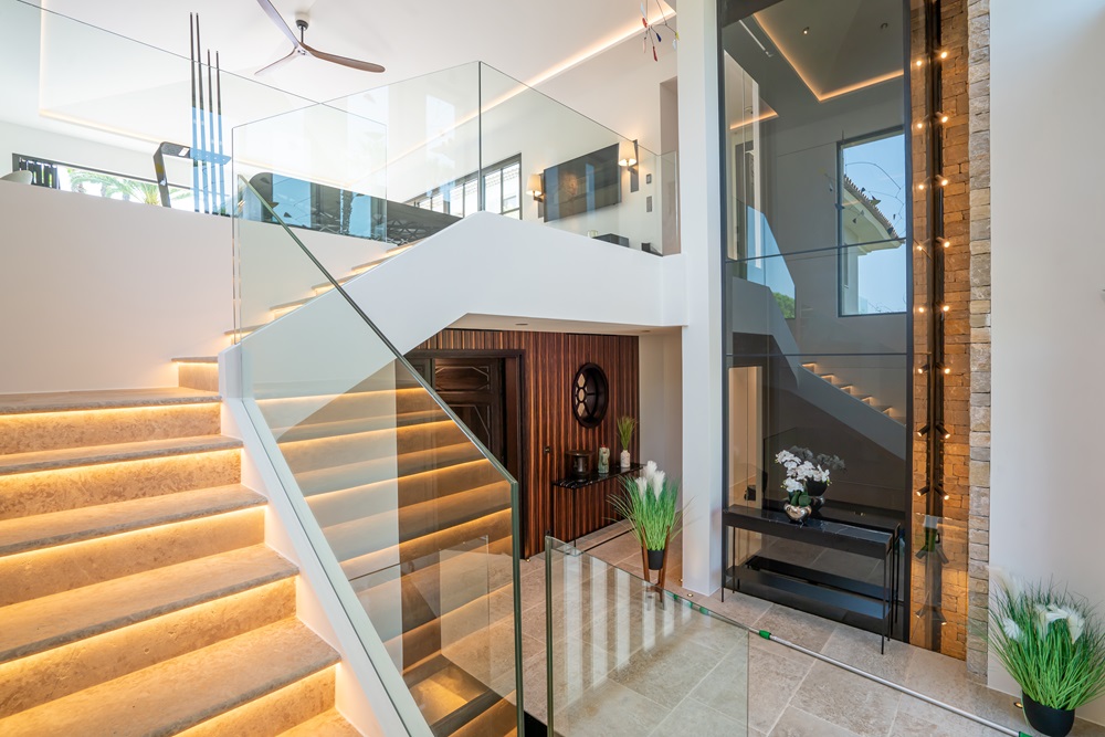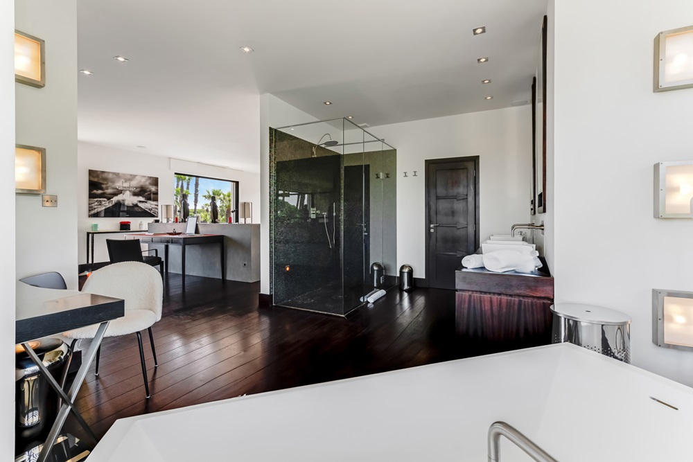 Villa 2 is 350 sq.m. and has 4 bedrooms, three bedrooms on the ground floor with en suite bathrooms and wc. A professional kitchen and utility room service room. Indoor gym with glass roof. On the first floor: Master bedroom with private terrace, from which you can enjoy great sea views and the palm tree garden. Open plan master bathroom with walk-in shower and bathtub.