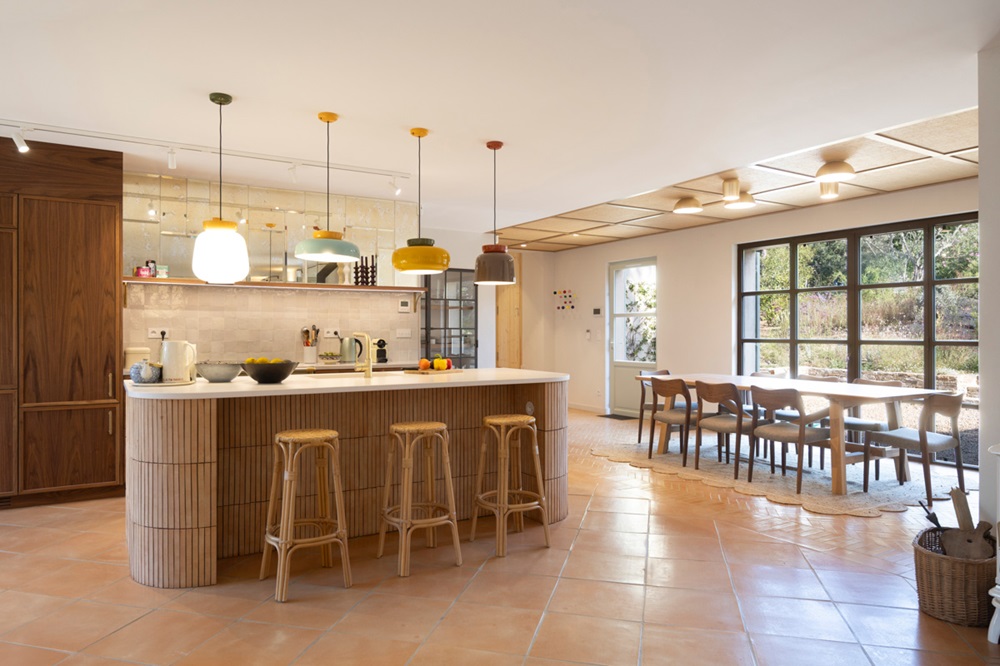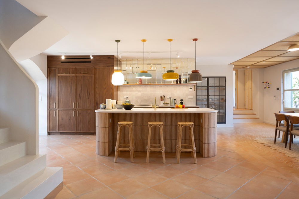 Step into a spacious, open-concept living area where the kitchen, dining, and sitting room flow seamlessly, designed for relaxed gatherings and laid-back Provençal living. The ground floor also hosts a generously sized bedroom with a queen-size bed (160 cm), a cosy sofa, and an en suite shower room with a large washbasin. Additional amenities include a cloakroom, a laundry room and a guest WC.